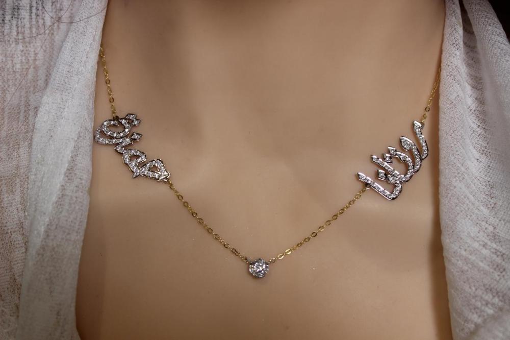 عقد ثنائي الإسم ابيض بفص زوكون وسلسال اصفر ذهب عيار 18 رقم المنتج Q34034